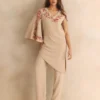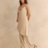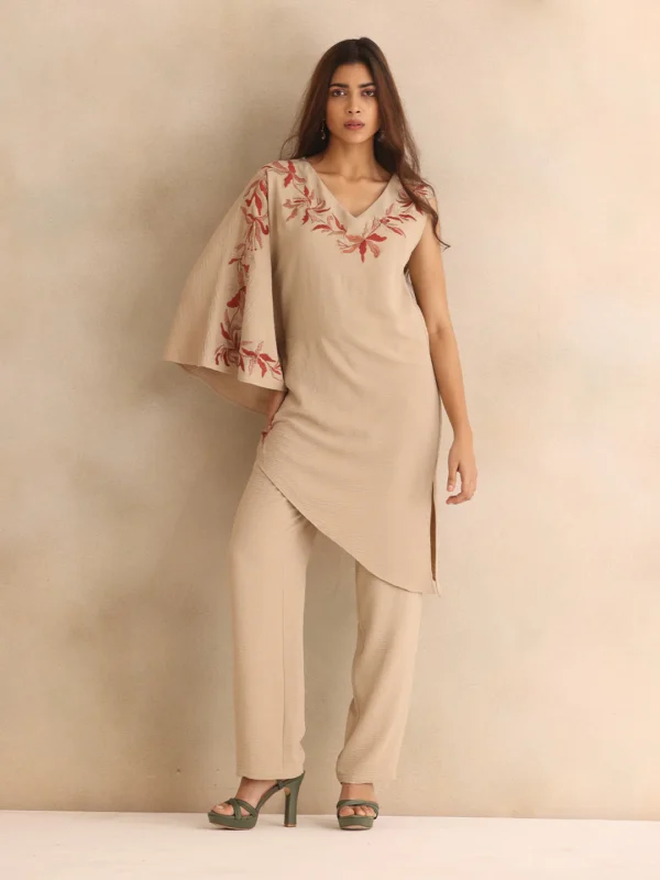 Featuring an embroidered V-neckline and a flattering silhouette, this co-ord set adds subtle sophistication to your look. The neutral beige tone complements a wide range of accessories and footwear, ensuring versatility for various occasions.