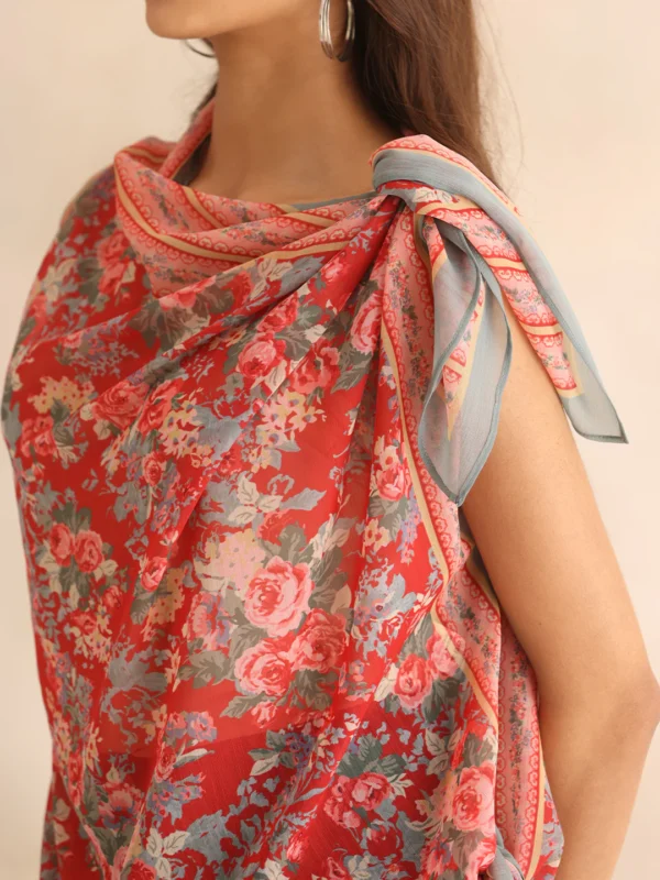 Red Cowl Neck Printed Sleeveless Drape Top with Cami